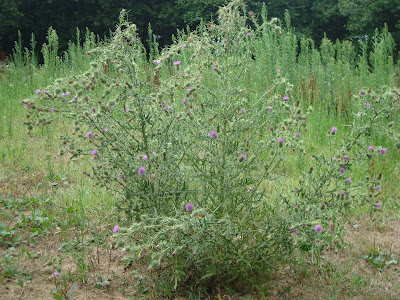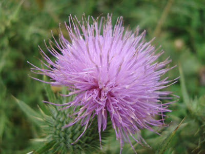 Las flores pequeñas, de color violeta y protegidas por una envoltura espinosa que se adhiere a la ropa facilitando su diseminación, sus frutos son negros.