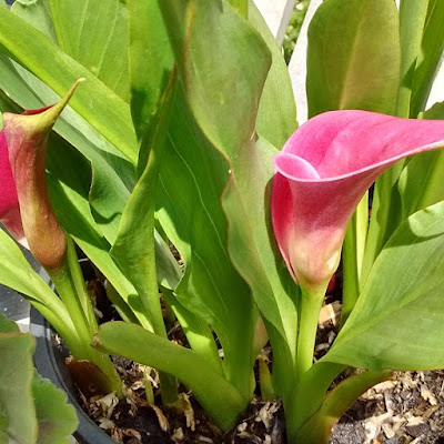 Zantedeschia Rehmanii de floración tardía, principios de verano, su espata roja o rosa envuelve el espádice de color blanco.