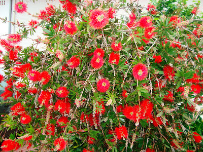 El nombre de esta curiosa planta de la familia de las “Mirtáceas” de las palabras griegas Kalli- hermoso y Stemon- Estambre, se dá muy bien en nuestros jardines, los llamativos “ escobillones” son en realidad los numerosos filamentos de la planta, sus hojas son perennes, si las tocamos desprenden un intenso olor a limón.