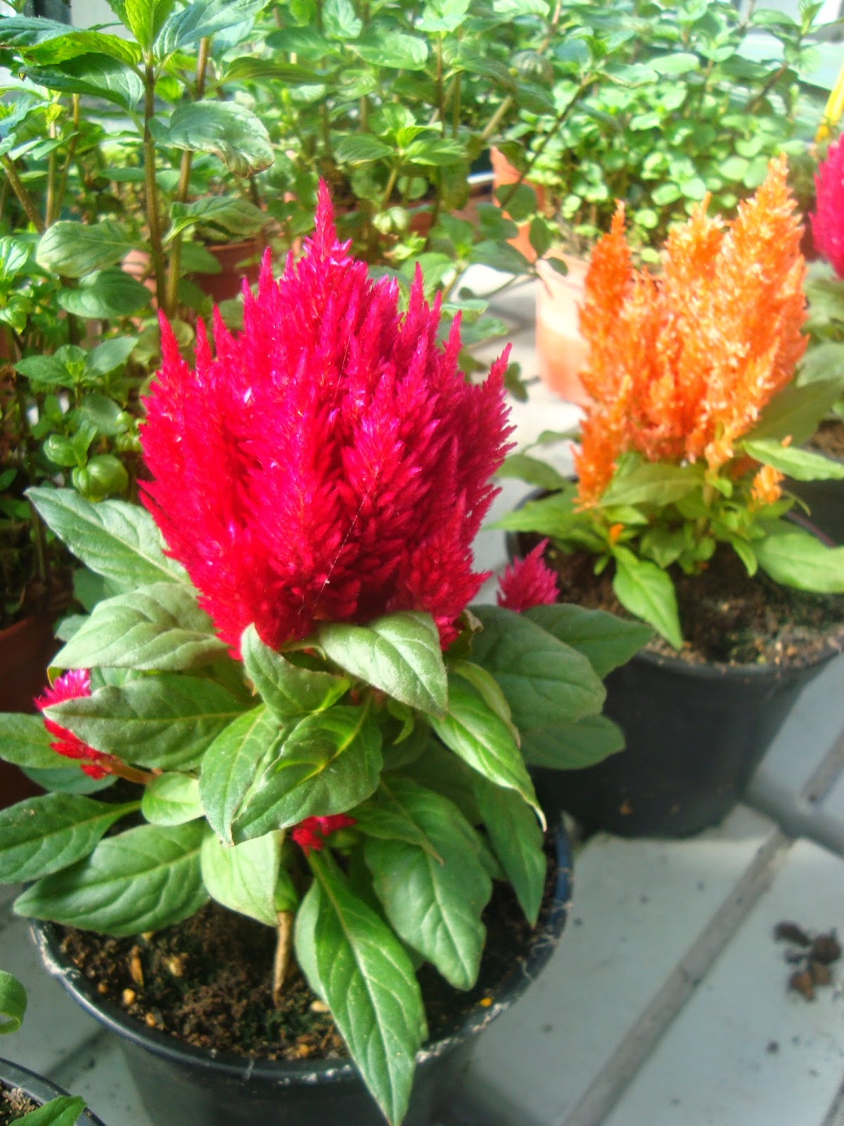 Familias de las Amaranthaceae existen alrededor de 50 variedades unas son anuales y otras perennes, se multiplican por semillas plantadas en primavera, las plumas o crestas según la variedad: Celosías Cristata, Kosmo, Penacho, etc. sirven tanto como flor fresca o seca ya que mantienen bien los colores; Naranjas, rojos, amarillos o rosas.: Celosia argentea. Florece desde el verano hasta bien entrado el otoño, se utiliza tanto en maceta como en el jardín, sus flores densas y plumosas sobresalen del follaje de sus hojas verdes lanceoladas.
