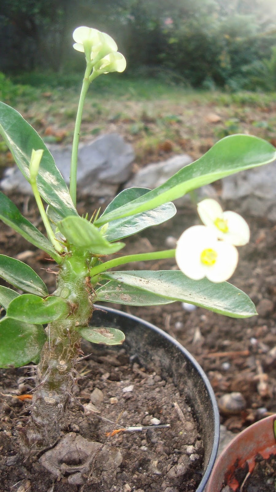 Sus hojas de forma oblonga espatuladas, verdes y provistas de espinas en su base pierde casi todas las hojas en invierno, posee un látex muy irritante, hay que evitar su contacto con la piel y ojos, ¡ cuidado con los niños! si ocurre lavar imediatamente las manos con jabón hasta limpiar todo el latex.
