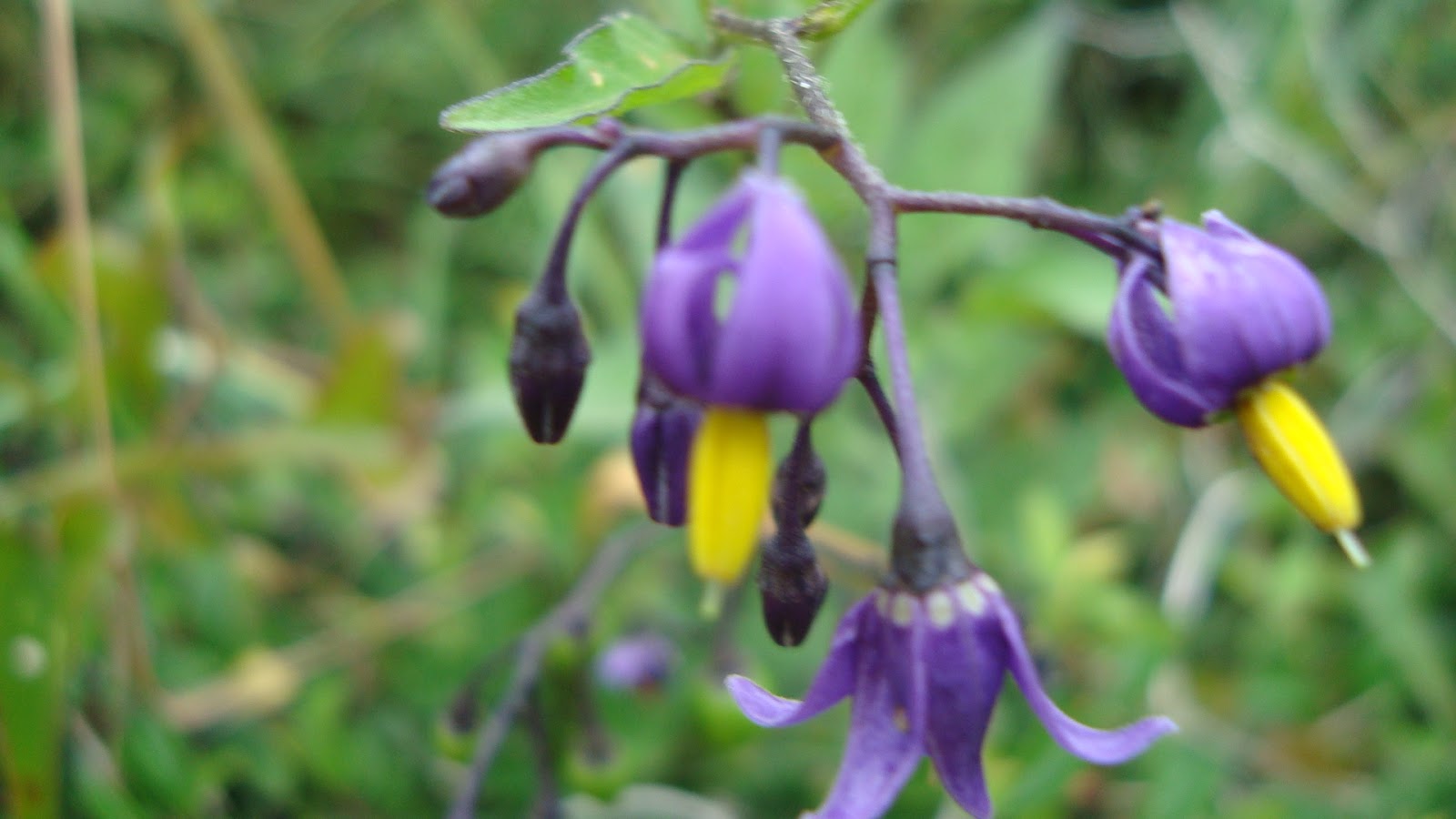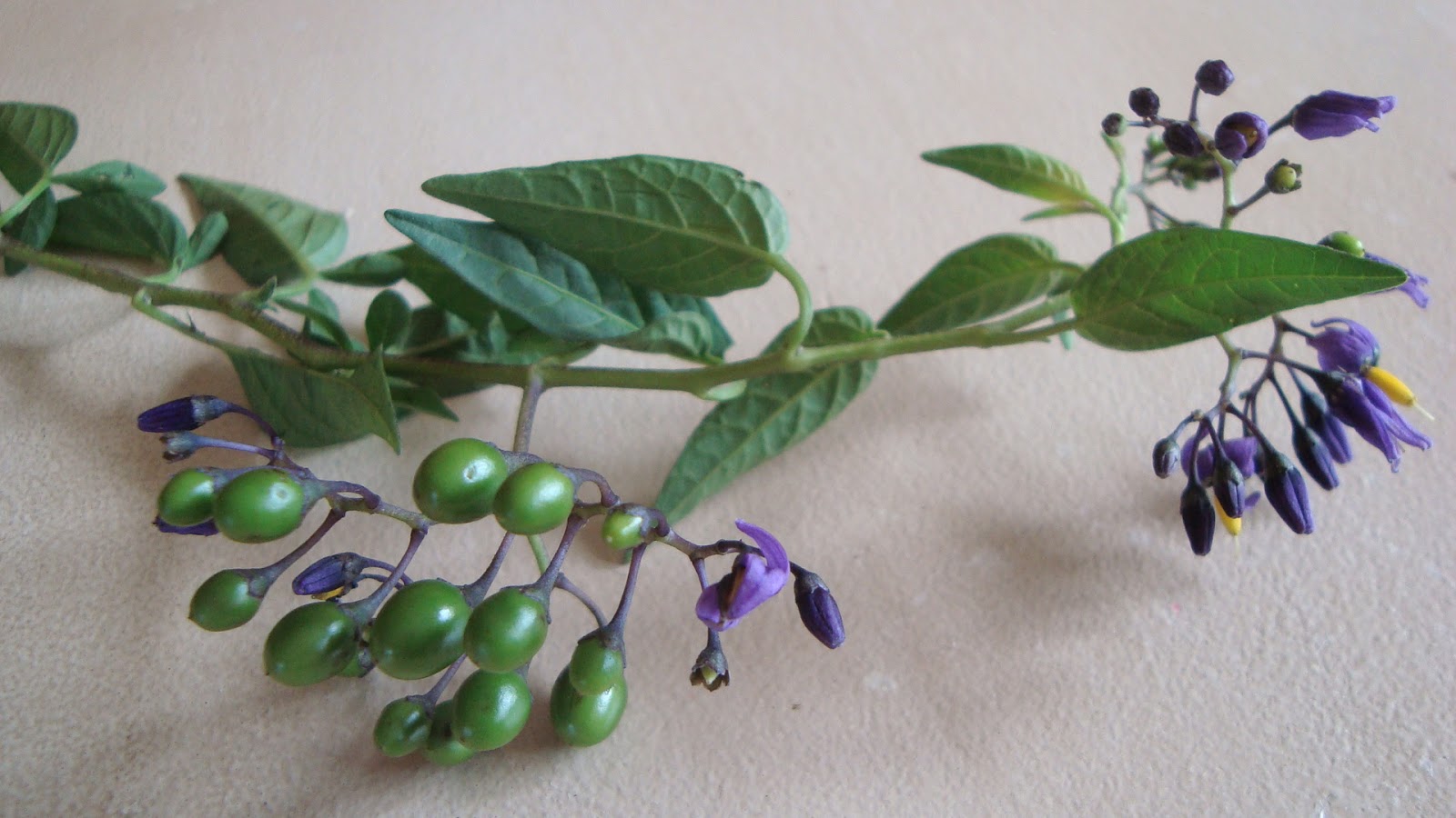 Familia de las solanáceas planta arbustiva de hasta 2 metros de longitud, tallos rastreros o trepadores. Hojas ovales, flores violetas con antenas amarillas, muy vistosas y los frutos verdes y de color rojo cuando están maduros. LLamada también: Amargamiel, solano dulce, matagallinas etc…