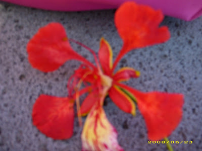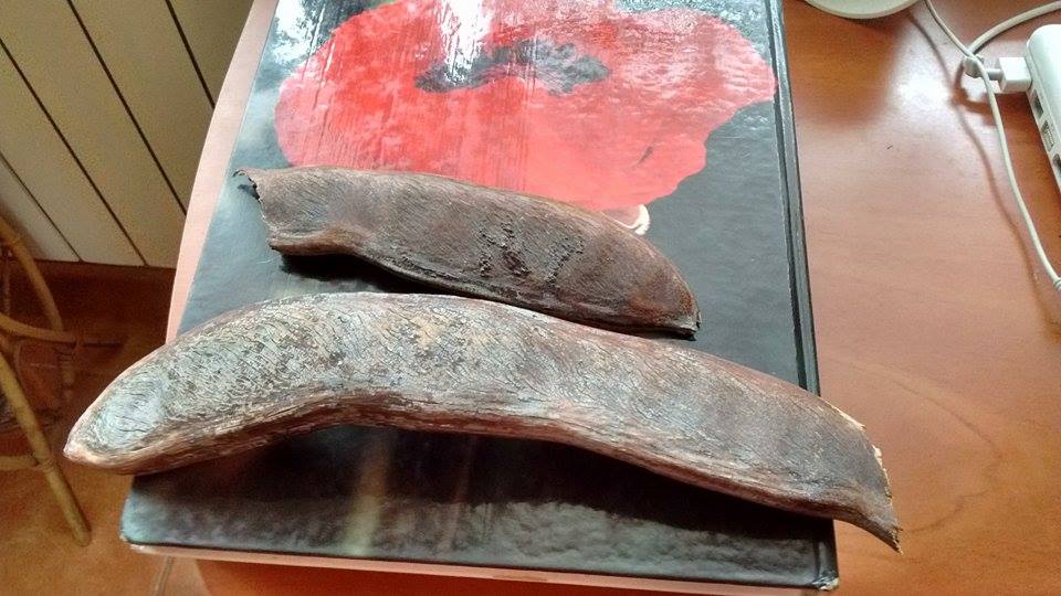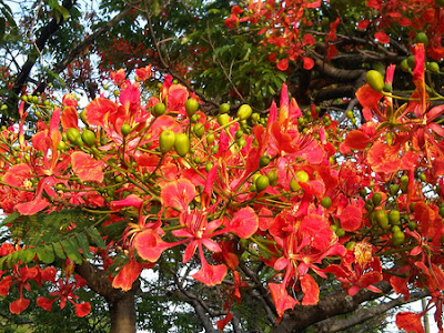 Tal y como se ve en la foto, son de tamaño mediano, de 10 a 15 metros de altura, una extensa copa en forma de sombrilla de terraza, con flores como ya os he dicho muy llamativas y sus hojas con 20 pares de pinnas (hojas compuestas). Mientras las contemplaba, pensaba como serían las semillas de aquella preciosidad hasta que vimos una vaina grande leñosa, que me hizo recordar a los algarrobos, de 40 a 60 cm. de largas y duras, y anchas de 5 a 7 cm. y claro, me la traje para casa. Le pregunté al guía como se llamaba y me dijo que en algunas partes de América Central lo llaman “ malinche “ y en Canarias y en el resto de mundo se conoce como Flamboyan, ( Delonix regia ) Familia de las leguminosas, la forma del tronco es más bien irregular y si cortas la corteza con un cuchillo brota una savia espesa y rojiza que se endurece rápida al contacto con el aire, seguramente para impedir enfermedades por la herida.
