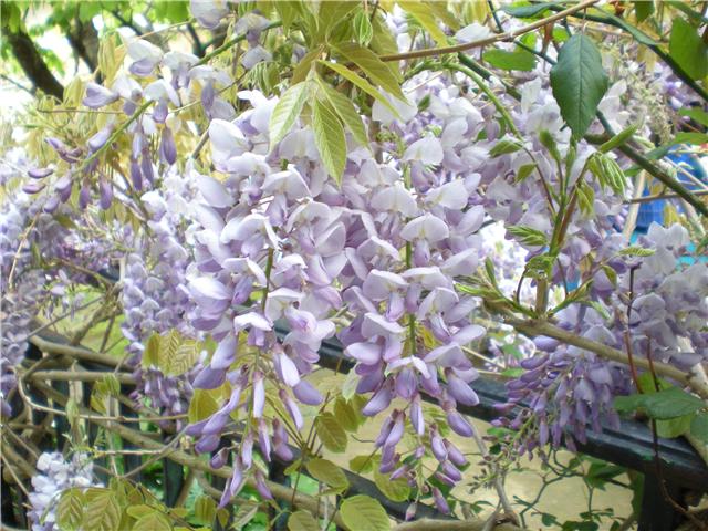 En primavera se llena de largos racimos de flores azuladas, blancas o lilas en muros, pérgolas etc. Es una de las trepadoras más vigorosas y caducifolias desarrolla troncos fuertes y retorcidos. Hay una variedad de racimos blancos y otra con racimos dobles blancos con amarillo en la base de crecimiento rápido. Se planta en otoño.