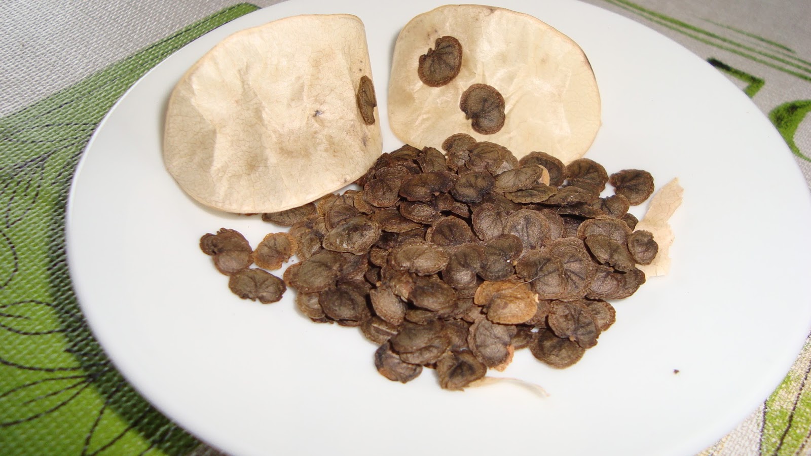 Hojas de la Lunaria después de » pelarlas » y sus semilla parecidas a las lentejas. Foto EL NAJO |