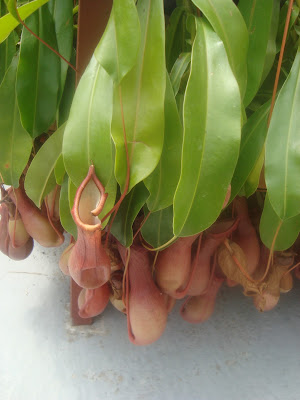 Son familia de las Nepenthaceae y llamadas plantas copa o jarra por su forma y existen una gran variación de ellas, segregan en su interior un jugo dulzón que anima a los insectos y estos caen en su interior.