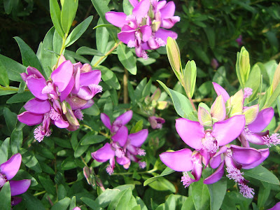 Este arbusto que vemos a menudo en los jardines es de la familia de las Poligaláceas, su hábitat en las zonas costeras subtropicales, de origen Sudafricano puede llegar a medir 3 metros, de copa densa redondeada con hojas alargadas, estrechas y verdes claro, en este tiempo están en plena floración con flores de color malva, blancas, púrpuras o rojo, están formadas por dos grandes pétalos y una cresta más clara, están en los racimos terminales de la flor.